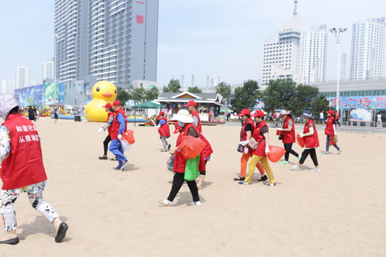 秦皇岛市佛协义工分组捡拾海滩上的垃圾
