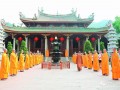 闽南佛学院师生在大殿前列队排班,等候迎接台湾佛教界代表来访台湾“中华人间佛教联合总会”一行与闽南佛学院代表于南普陀寺普照