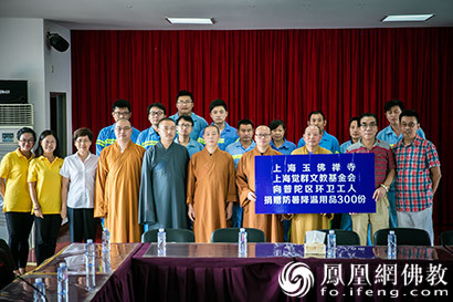 2018年8月15日,受中国佛教协会副会长、上海玉佛禅寺方丈、上海觉群文教基金会理事长觉醒大和尚委托,上海玉佛禅寺监院、寺务处主任长春法师,寺务处副主任、上海觉群文教基金会秘书长慧觉法师等一行,前往上海市普陀区支队及环卫公司,慰问在高温天气坚守岗位的指战员和环卫工人,并为他们送去了防暑清凉大礼包。